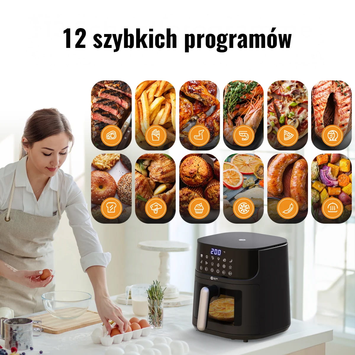 Wystarczy wybrać program (np. frytki, kurczak, ryba, warzywa, pizza), a urządzenie automatycznie ustawi odpowiednią temperaturę i czas.