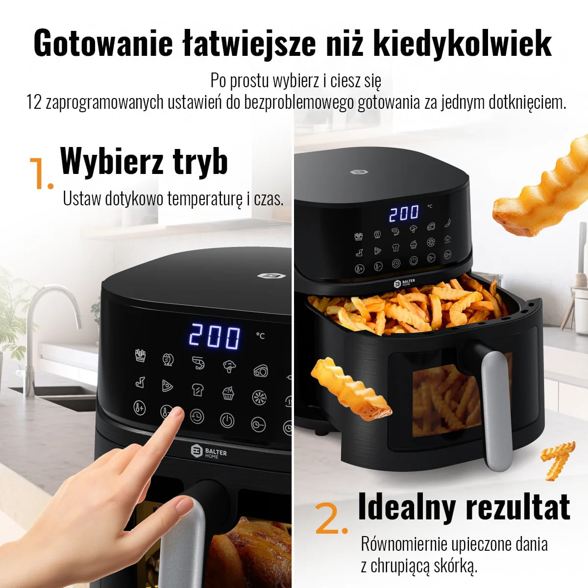 Balter HL-551T to nowoczesna frytkownica na gorące powietrze, która łączy stylowy wygląd z wyjątkową funkcjonalnością. Dzięki dużej pojemności 5,5 litra i aż 12 automatycznym programom, doskonale sprawdzi się zarówno do szybkich przekąsek, jak i pełnowartościowych obiadów. Innowacyjna technologia gorącego powietrza pozwala przygotować potrawy z minimalną ilością tłuszczu – nawet do 85% mniej niż w tradycyjnych metodach smażenia. To idealny wybór dla całej rodziny – zdrowo, smacznie i wygodnie!