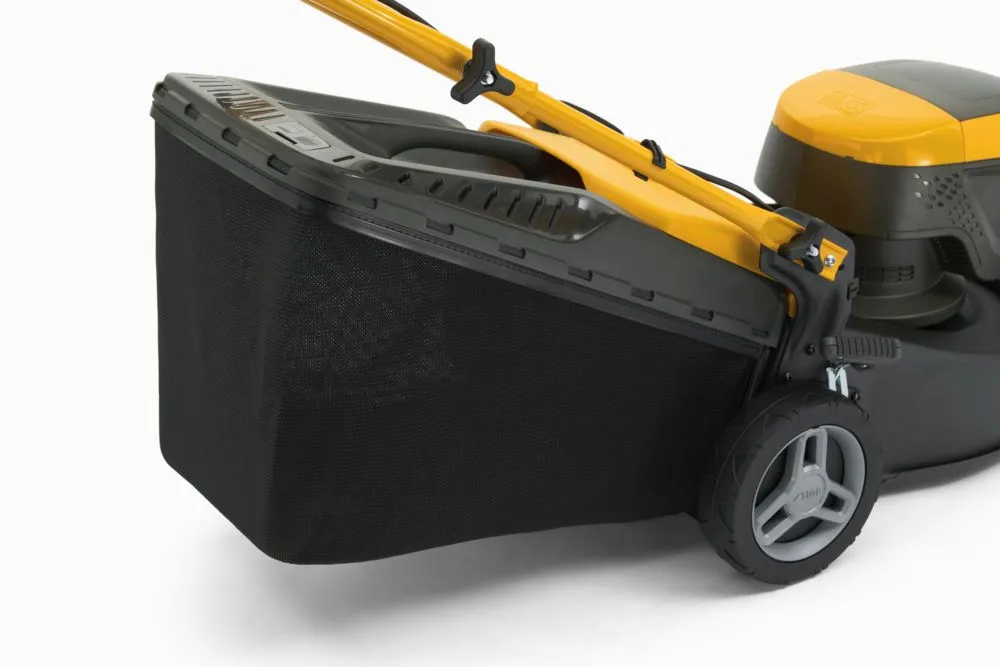 Pojemny kosz o pojemności 60 L pozwala na dłuższą pracę bez potrzeby opróżniania. Hybrydowa konstrukcja łączy sztywną plastikową pokrywę z elastyczną, przepuszczającą powietrze częścią materiałową, co ułatwia opróżnianie i poprawia zbieranie skoszonej trawy.