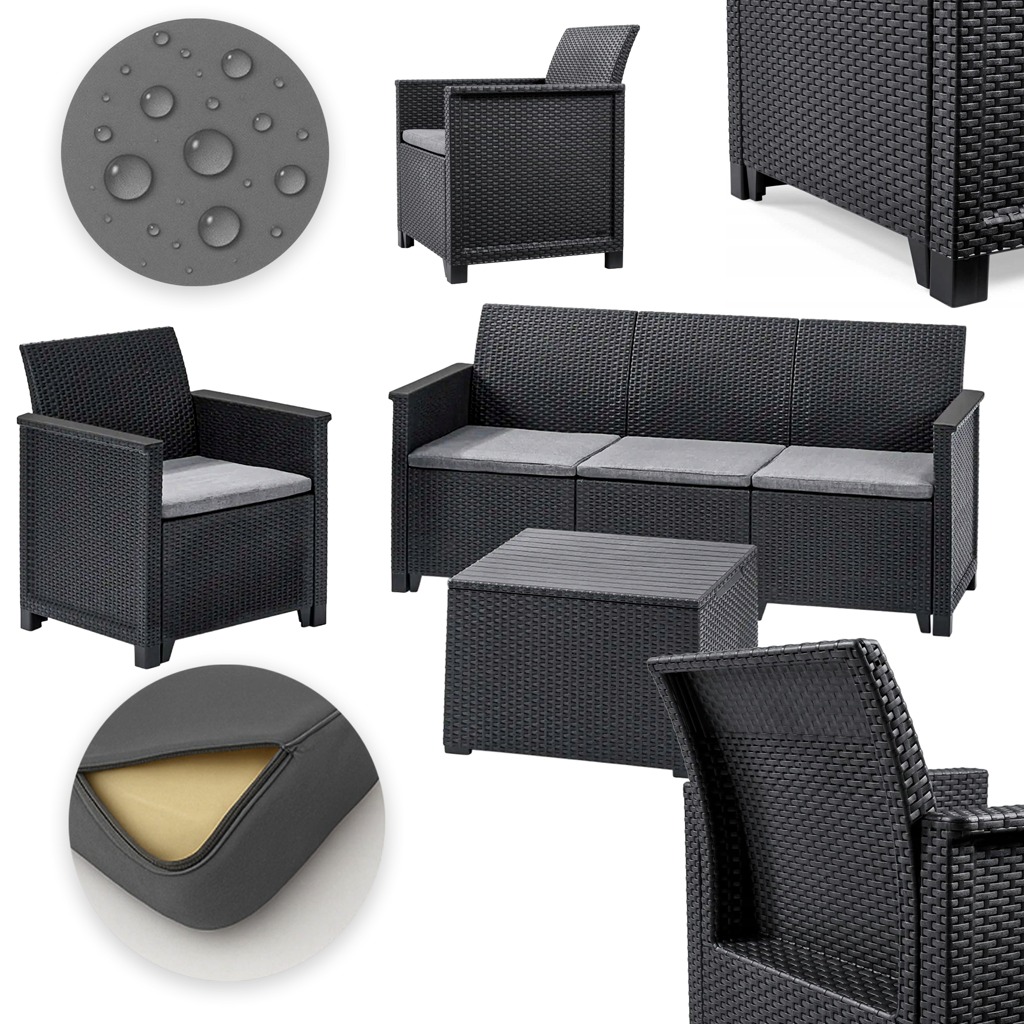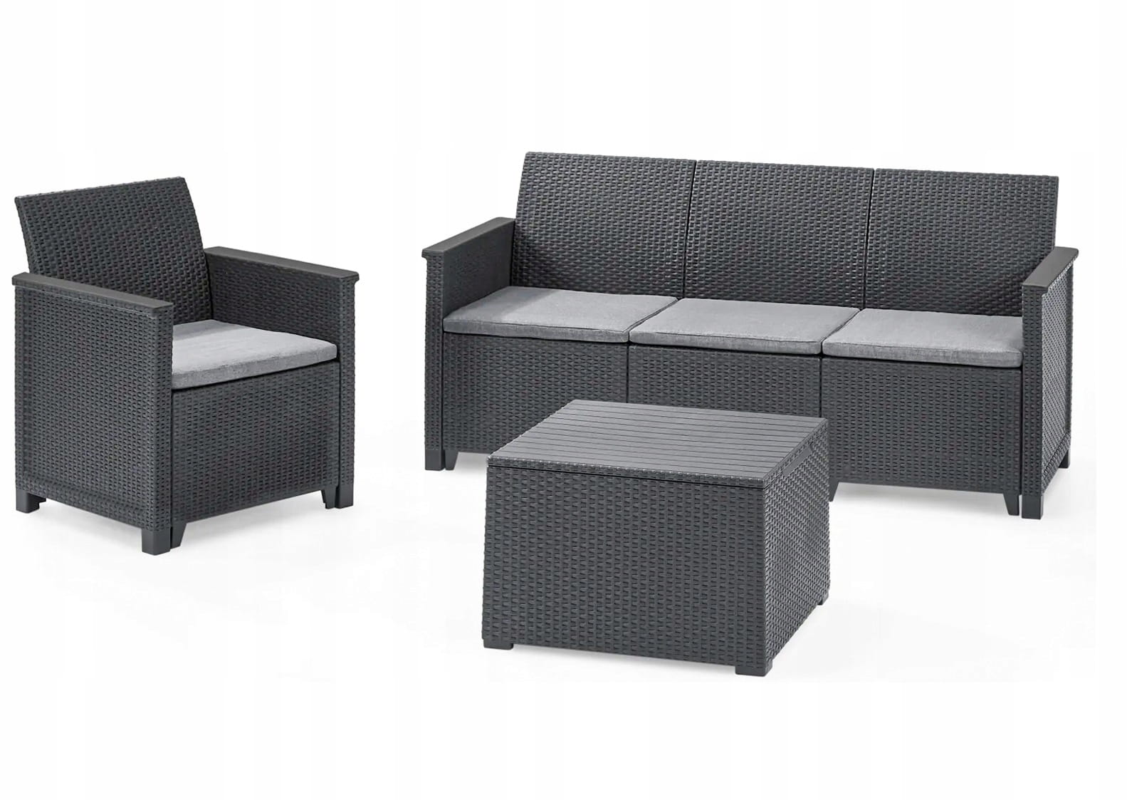 Ergonomiczne oparcia oraz miękkie poduszki zapewniają wysoki komfort użytkowania, a materiał wykonania – 89% tworzywo z recyklingu odporne na promieniowanie UV – gwarantuje trwałość, łatwą pielęgnację i troskę o środowisko. W zestawie znajduje się również stolik z funkcją schowka (35 litrów), który doskonale sprawdzi się do przechowywania poduszek, koców czy drobnych akcesoriów.
