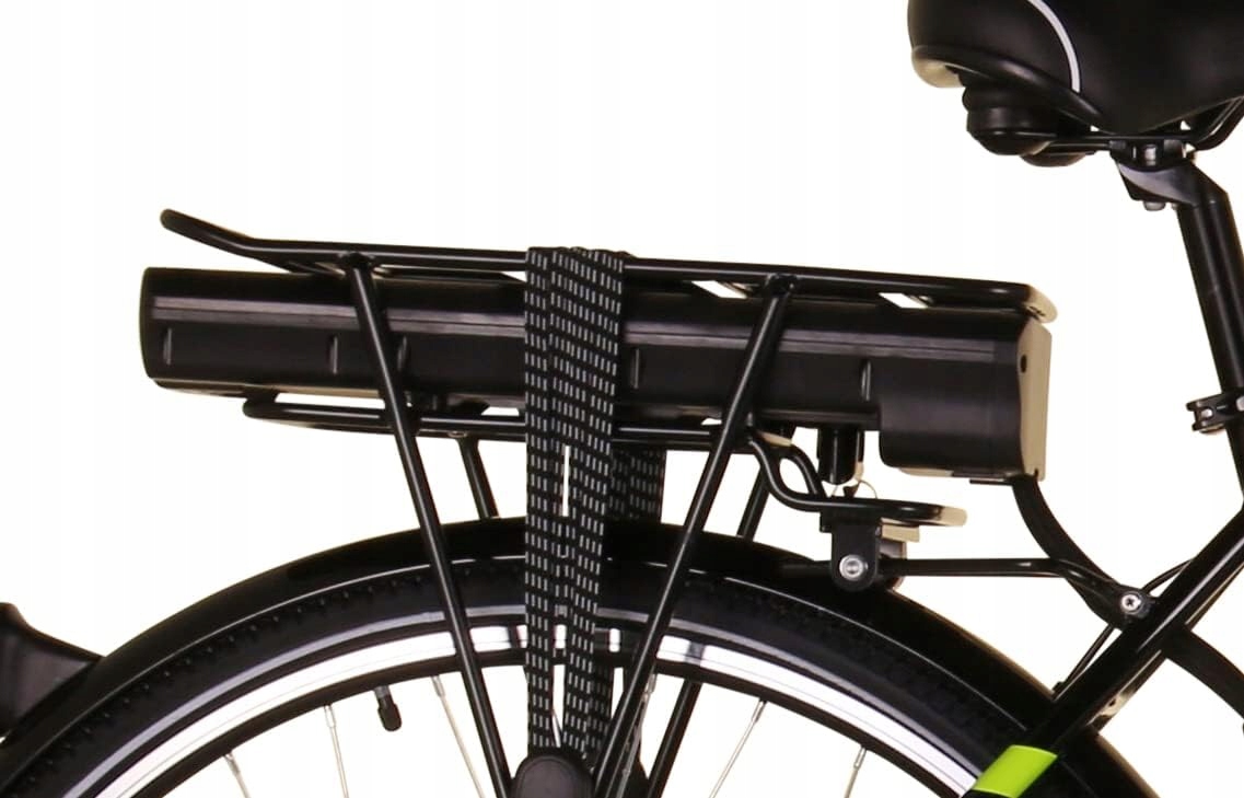 Rower posiada tylny silnik elektryczny oraz akumulator zamontowany na bagażniku, co zapewnia stabilną i przewidywalną charakterystykę jazdy. Wyprostowana pozycja za kierownicą zwiększa komfort, a pełne wyposażenie miejskie pozwala korzystać z roweru od razu po zakupie.