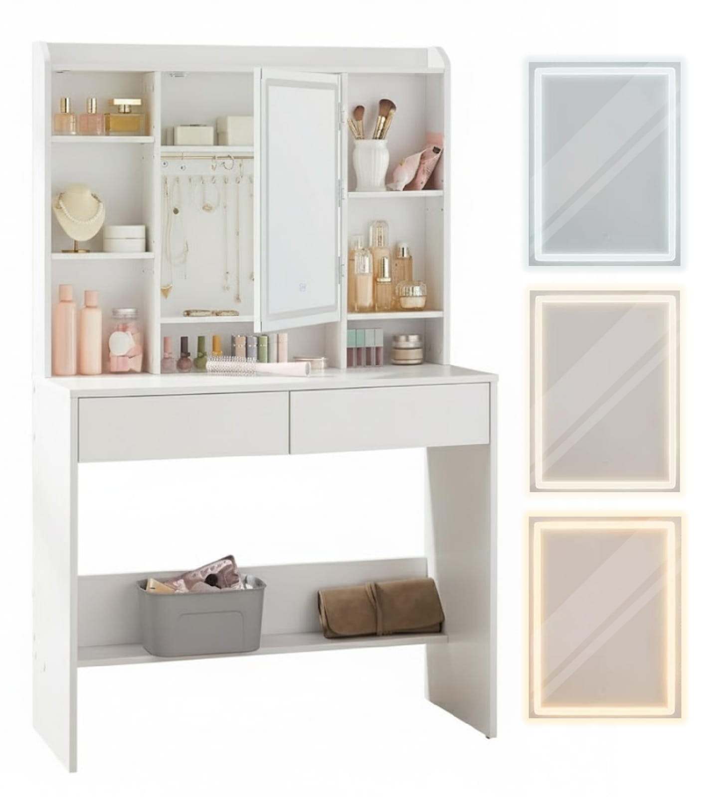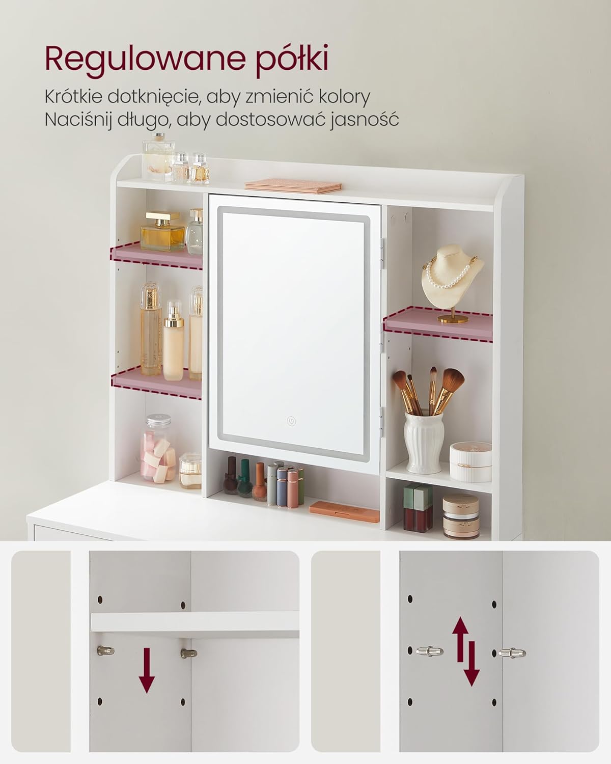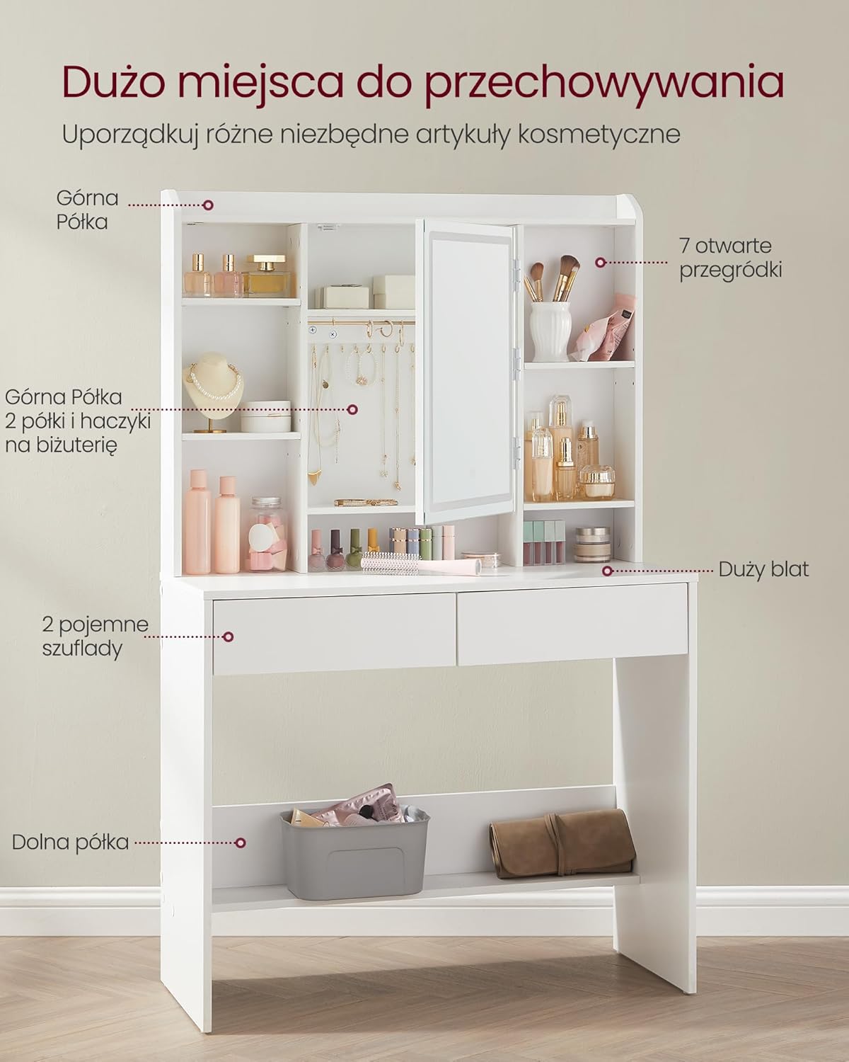 Liczne półki i szuflady pomagają zachować porządek wśród kosmetyków, perfum i akcesoriów.