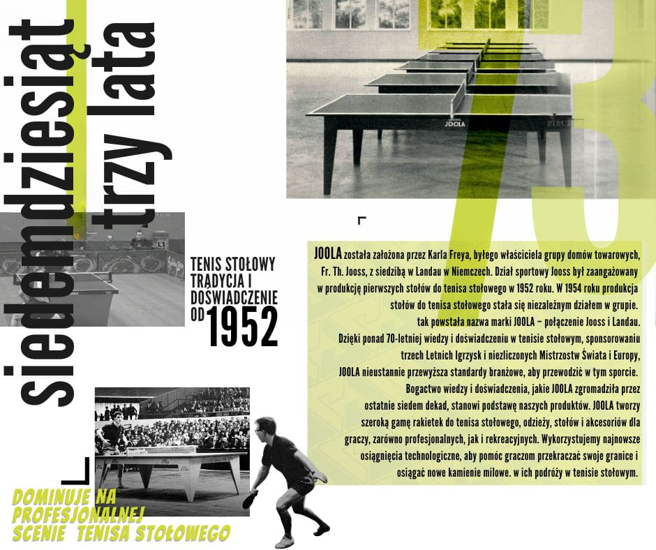 Joola to renomowana niemiecka marka założona w 1952 w Landau, znana na całym świecie z wysokiej jakości stołów do tenisa stołowego oraz akcesoriów sportowych. Jako oficjalny dystrybutor produktów Joola, oferujemy w ofercie stoły i akcesoria do tenisa oraz coraz bardziej popularnego pickleballa. Marka ta, nieustannie rozszerza swoje portfolio, wprowadzając nowe produkty i wpisując się w rozwój dynamicznie rosnących dyscyplin.